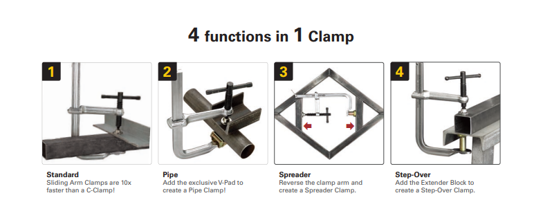 Ved å investere i tilbehørspakken - får du 4 løsninger i en klemme! Med den ekslusive og patenterte V-paden kan du gjøre tvingen om til en rør-tvinge, og med Extender Block kan tvingen enkelt gjøres om til både step-over tvinge og en spredetvinge.